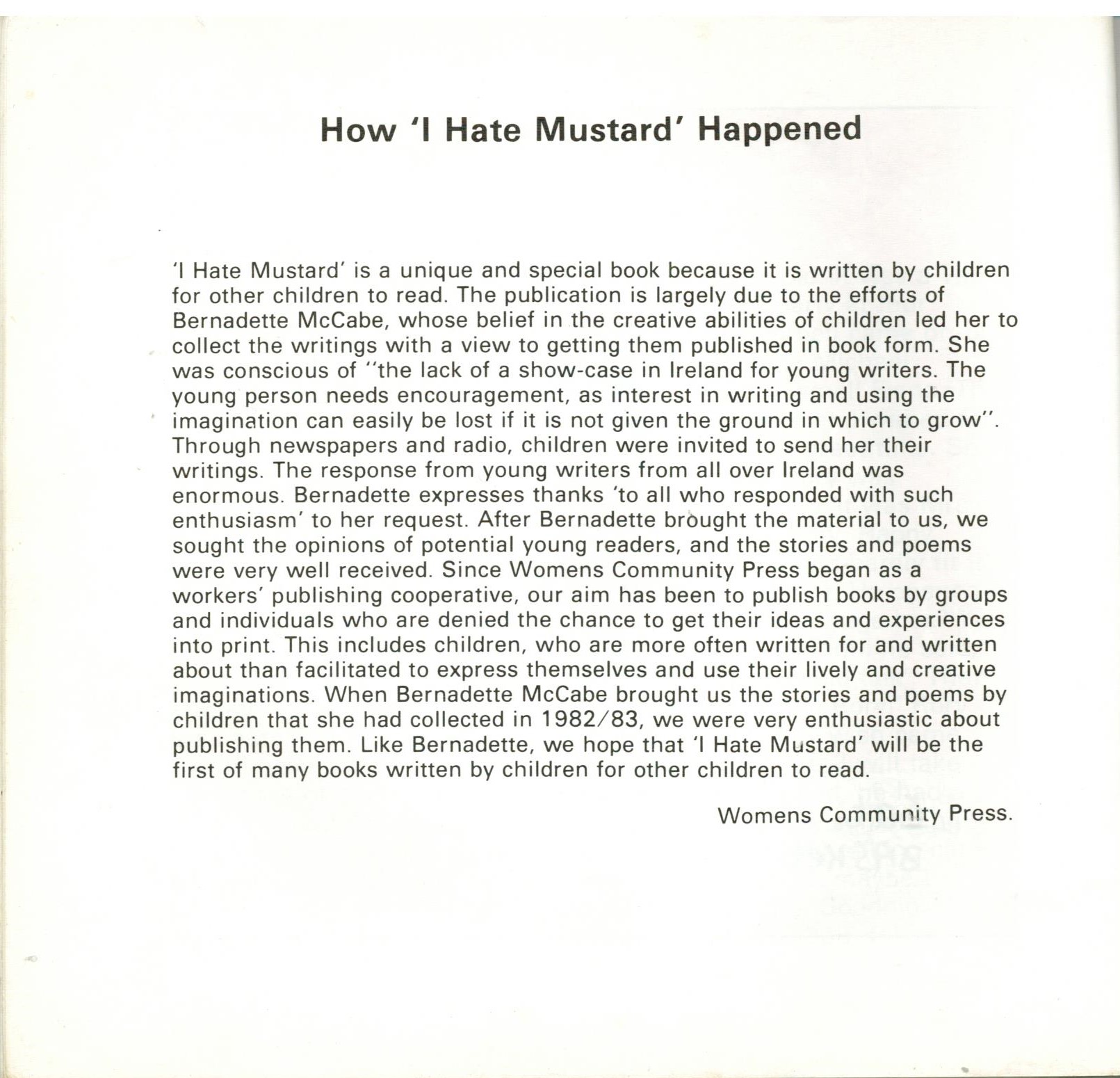 I Hate Mustard was a book published in 1984 by the Women’s Community Press, a collective committed to providing creative opportunities for all, regardless of age, gender or social class.